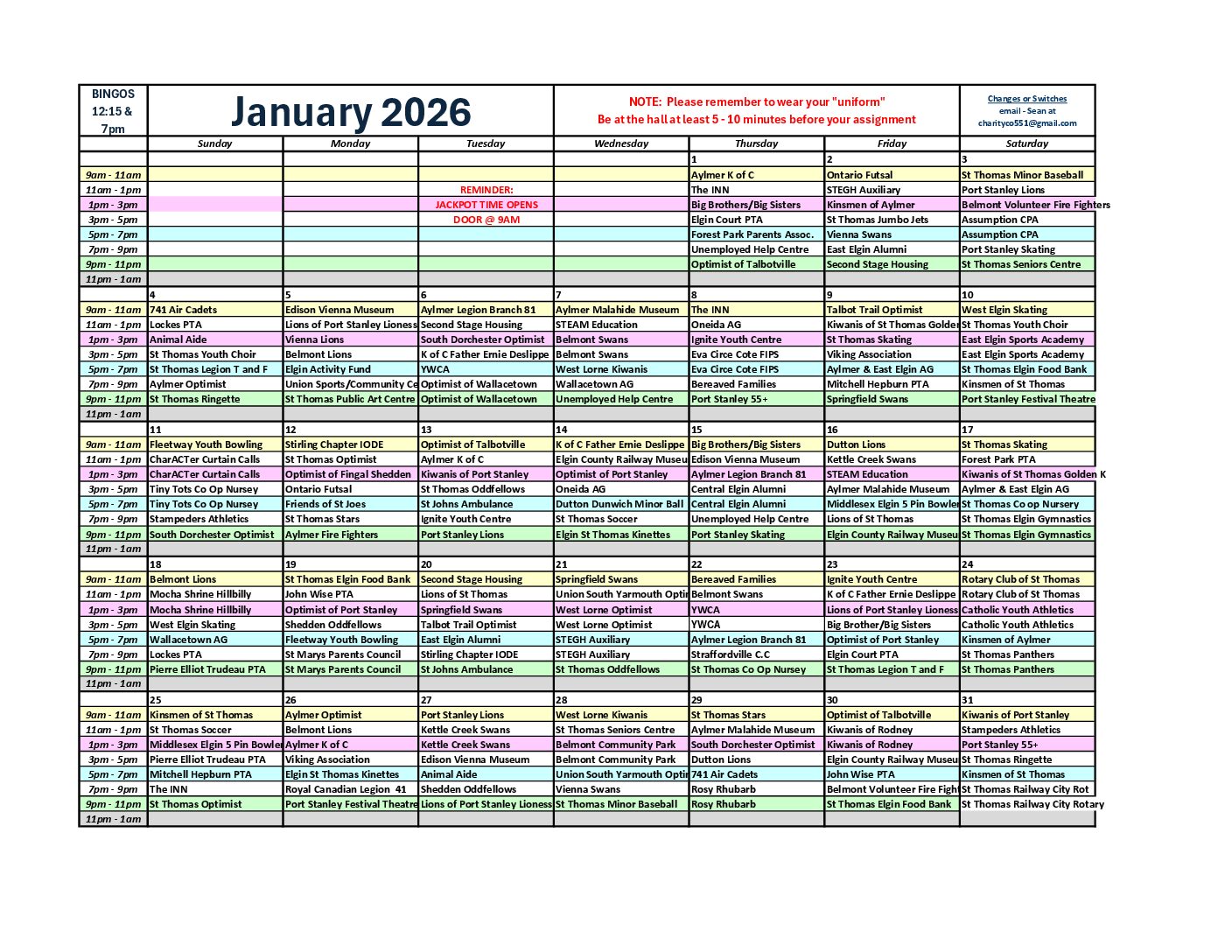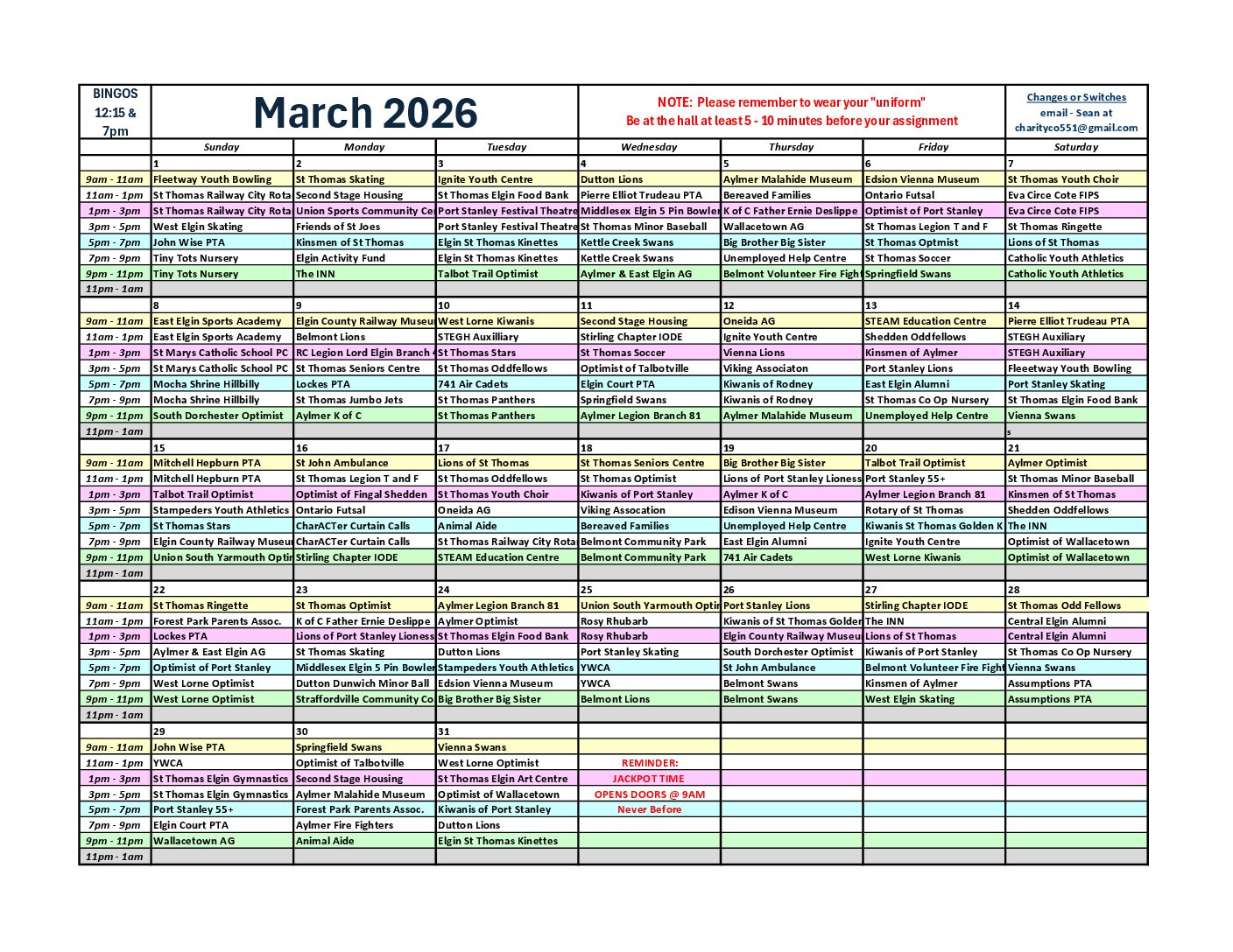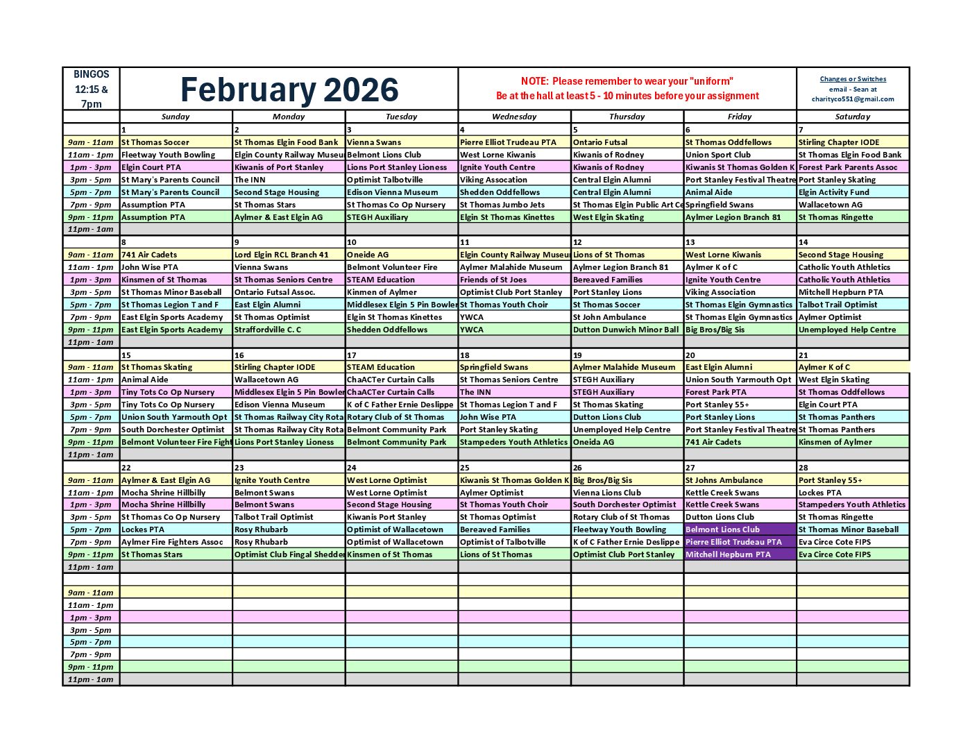 Assignment schedules have been provided to each organizations contacts, by the Charity Coordinator, please check your emails.